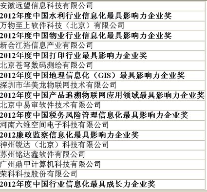 ?????? 大會同時揭曉了2012中國行業(yè)信息化評選活動獲獎榜單,思科、東軟、星網(wǎng)視易、星網(wǎng)銳捷等200余家行業(yè)信息化標桿企業(yè)分別在本次活動中榮獲企業(yè)類、產(chǎn)品類等獎項。其中華美龍公司在此次評選活動中榮獲:“2012年度中國產(chǎn)品追溯物聯(lián)網(wǎng)應用領域最具影響力企業(yè)獎”。