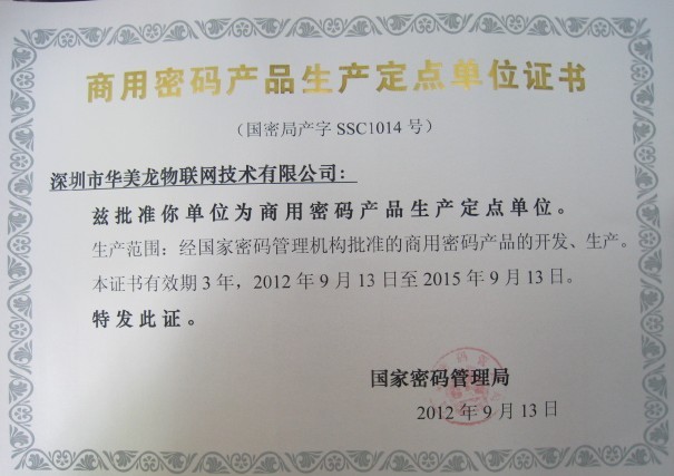??? (本網(wǎng)訊 記者張小燕)2012年11月,深圳市密碼管理局領(lǐng)導(dǎo)一行三人受中國(guó)國(guó)家密碼管理局委托,蒞臨深圳市華美龍物聯(lián)網(wǎng)技術(shù)有限公司,給華美龍頒發(fā)了《商用密碼產(chǎn)品生產(chǎn)定點(diǎn)單位證書(shū)》,這是深圳市華美龍物聯(lián)網(wǎng)技術(shù)有限公司榮獲的又一個(gè)國(guó)家級(jí)證書(shū)。